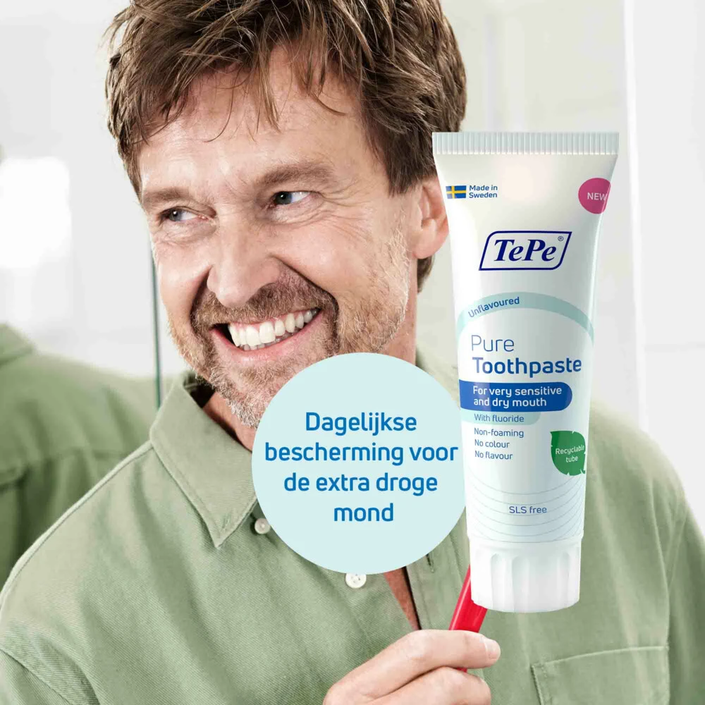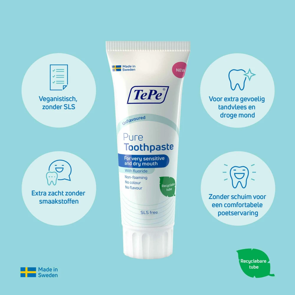 TePe Pure Tandpasta UnflavouredTePe Pure TePe Pure tandpasta, voor gevoelig tandvlees en droge mond klachten, is een milde niet-schuimende tandpasta zonder smaak die 1450 ppm fluoride bevat om gaatjes te helpen voorkomen. TePe Pure tandpasta bevat geen schuimmiddel, geen kleurstof, geen toegevoegde smaakstoffen, geen microplastic en is vrij van natriumlaurylsulfaat (SLS), een schuimmiddel dat gevoelig mondweefsel kan irriteren. De TePe Pure tandpasta’s zijn verkrijgbaar met milde pepermunt