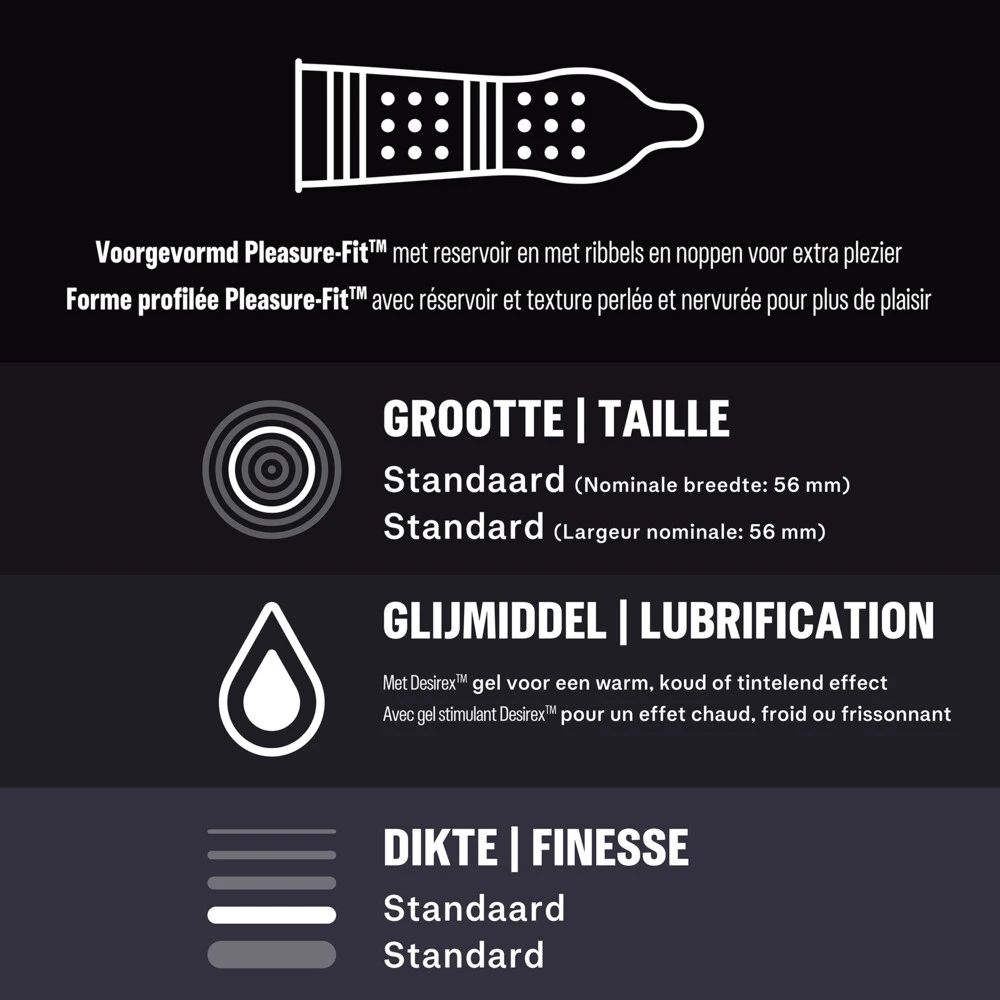 Durex Orgasmu0027Intense PakketDe Durex Orgasm’Intense-condooms zijn ideaal om je partner nog intenser te laten genieten. De ribbels en nopjes zorgen voor extra stimulatie en de condooms zijn voorzien van een speciaal glijmiddel met een warm, koud of tintelend effect dat je partner een nog intenser orgasme zal bezorgen. Perfecte sensatie: condooms met durex desirextm gel, voor een verwarmende, verkoelende of tintelende sensatie.Extra stimulerend: stimulerende textuur met ribbels en n