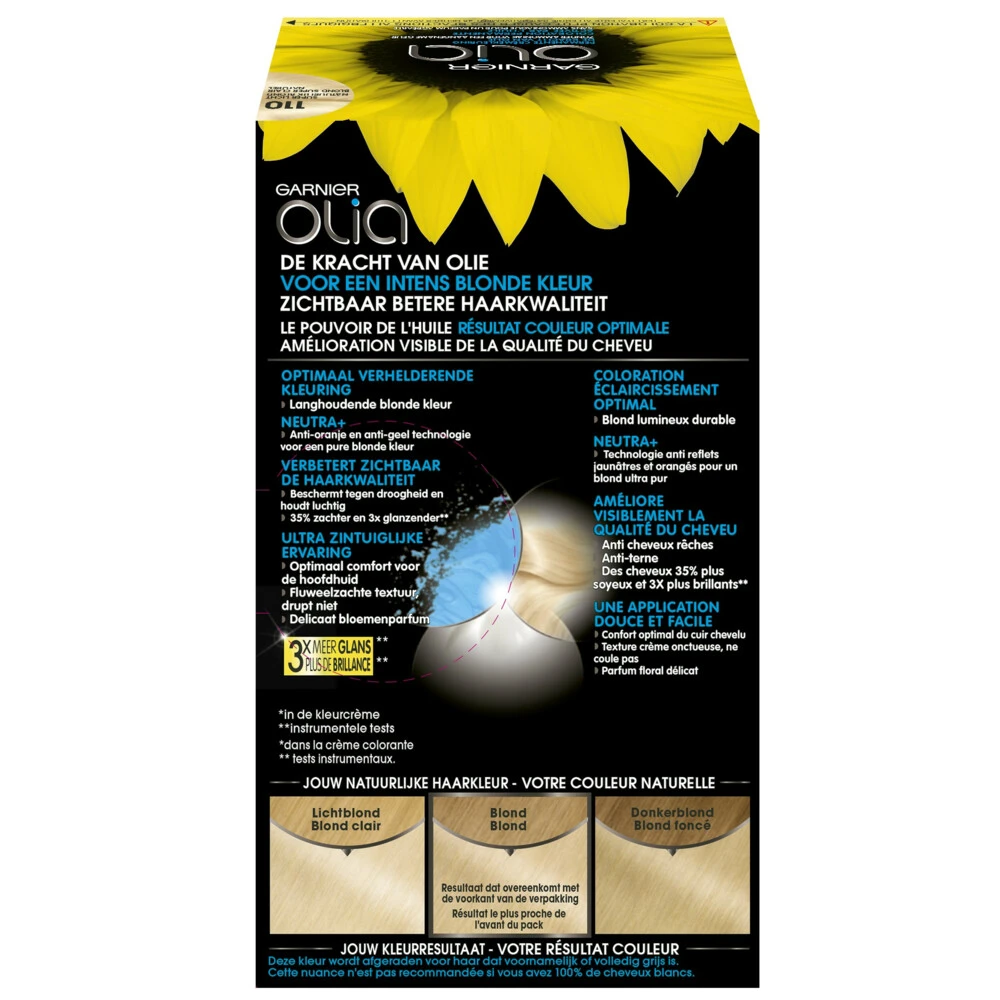 Garnier Olia 110 – Verheldering – Haarverf:- Intense, levendige en langhoudende kleur- Zichtbaar verbeterde haarkwaliteit, kleur na kleur- 3x Glanzender haar**- 35% zachter haar**- Zonder ammoniak voor een aangename geur- Tot 100% GrijsdekkingErvaar nu de kracht van pure oliën met Garnier Olia!De permanente thuiskleuring met 100% grijsdekking op basis van 60% oliën* geeft het haar een intense kleur, een schitterende glans, en zichtbaar verbeterde haarkwaliteit, kleur na