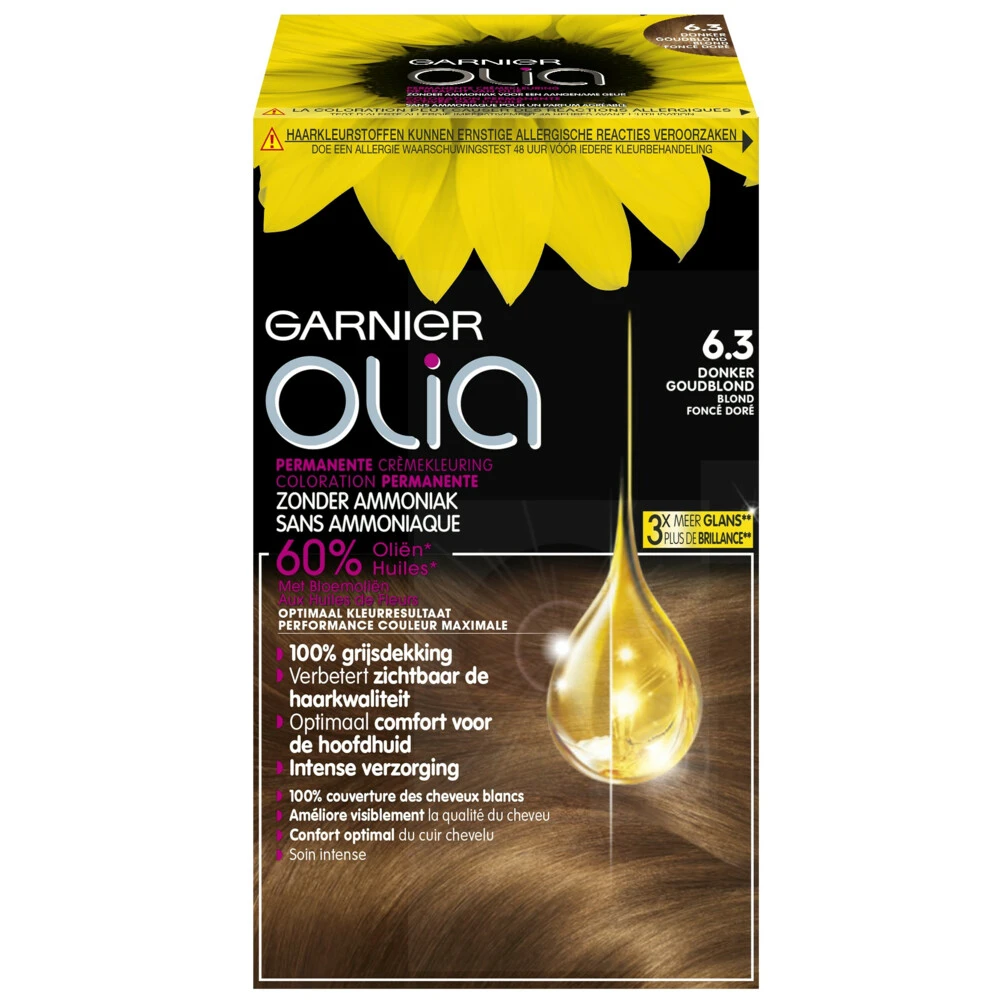 Garnier Olia 6.3 – Donker GoudblondErvaar de Olia haarkleuring van Garnier voor een prachtig resultaat. Door het gebruik van oliën wordt een optimale kleuring van de haarvezel bereikt en wordt de kwaliteit van het haar zichtbaar verbetert. En de Olia haarkleuring bevat een fijn subtiele geur.100% grijsdekkingVerbetert zichtbaar de haarkwaliteit35% zachter en 17% glanzender haarMaakt tot wel 3 tinten lichterOlia van Garnier is een haarkleuring die gemakkelijk en prettig is aan te breng