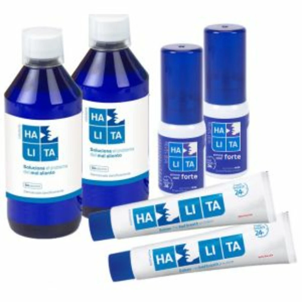 Halita Voordeelpakket met Mondwater, Mondspray, TandpastaDit Halita Slechte Adem Navul voordeelpakket bevat alle artikelen om snel van een slechte adem af te komen en een frisse adem te krijgen.