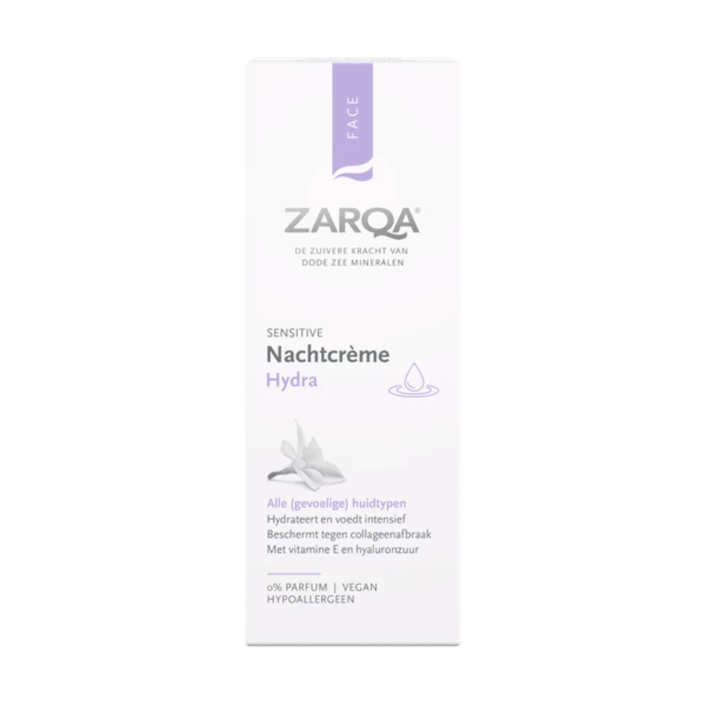 Zarqa Nachtcreme Hydra 50 mlDeze Zarqa Nachtcrème Hydra, met hyaluronzuur, ondersteunt het herstellend vermogen van de huid gedurende de nacht. Geeft een intensieve hydratatie tot in de diepere huidlagen en is ideaal voor de verzorging van de (gevoelige) vochtarme huid. Daarnaast beschermt het actief tegen huidveroudering en schadelijke invloeden van buitenaf, zoals luchtvervuiling. Het verlaagt de kans op het ontstaan van pigmentvlekken en beschermt het DNA. De Zarqa Nachtcreme Hyd
